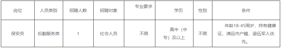 清遠(yuǎn)市清城區(qū)機關(guān)事務(wù)管理局因工作需要,根據(jù)《關(guān)于印發(fā)<清遠(yuǎn)市清城區(qū)機關(guān)事業(yè)單位專項工作聘員、合同制聘員以及后勤服務(wù)類人員管理辦法>的通知》(城區(qū)人社[2022]20號)文件精神,面向社會公開招聘后勤服務(wù)類人員1名,現(xiàn)將有關(guān)事宜公告如下: