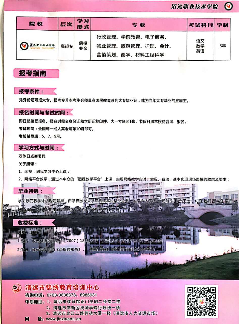 北京大學、清遠職業(yè)技術(shù)學院圓夢計劃正式啟動,三年學費只需5000元,考試前一百名三年學費只需1000元,心動不如行動,趕快加入圓夢計劃吧!咨詢熱線:0763-3630112 報名地址:清遠市北江二路勞動大廈一樓